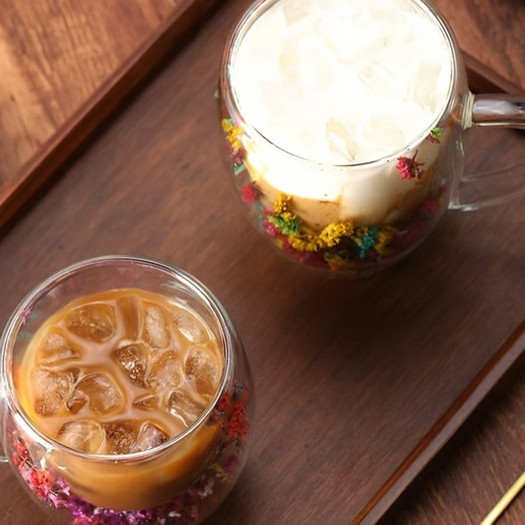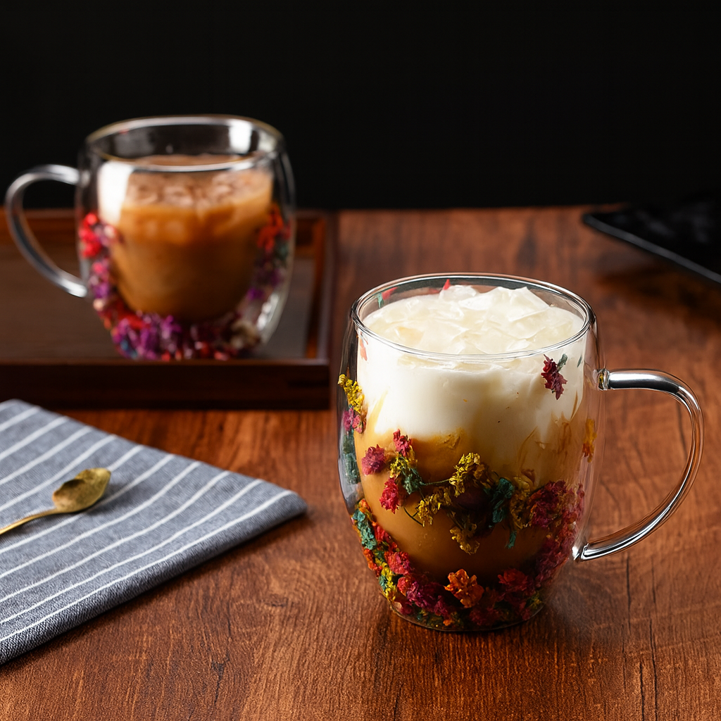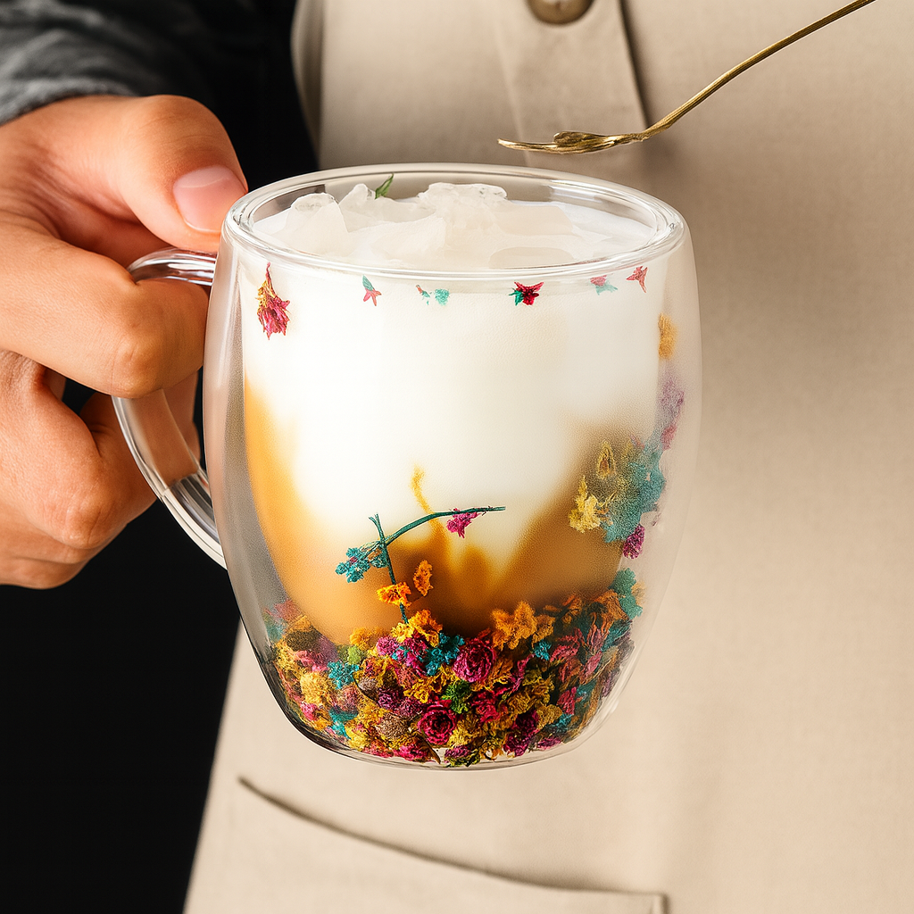 Transforme seus momentos de café, chá ou cappuccino em experiências únicas com esta xícara de vidro de parede dupla, que une design sofisticado e funcionalidade. O destaque vai para as flores naturais preservadas entre as camadas de vidro, tornando cada peça exclusiva e decorativa.